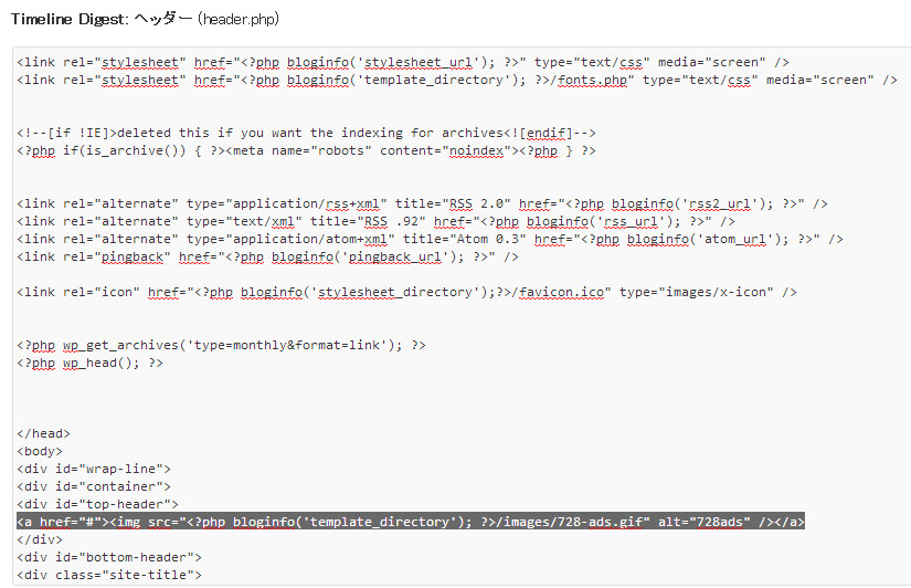 外観→テーマ編集より、「ヘッダー (header.php)」を開き、上記の選択部分「<a href="#"><img src="<?php bloginfo('template_directory'); ?>/images/728-ads.gif" alt="728ads" /><a>」を、アドセンスのタグに貼り替えればよいのです。